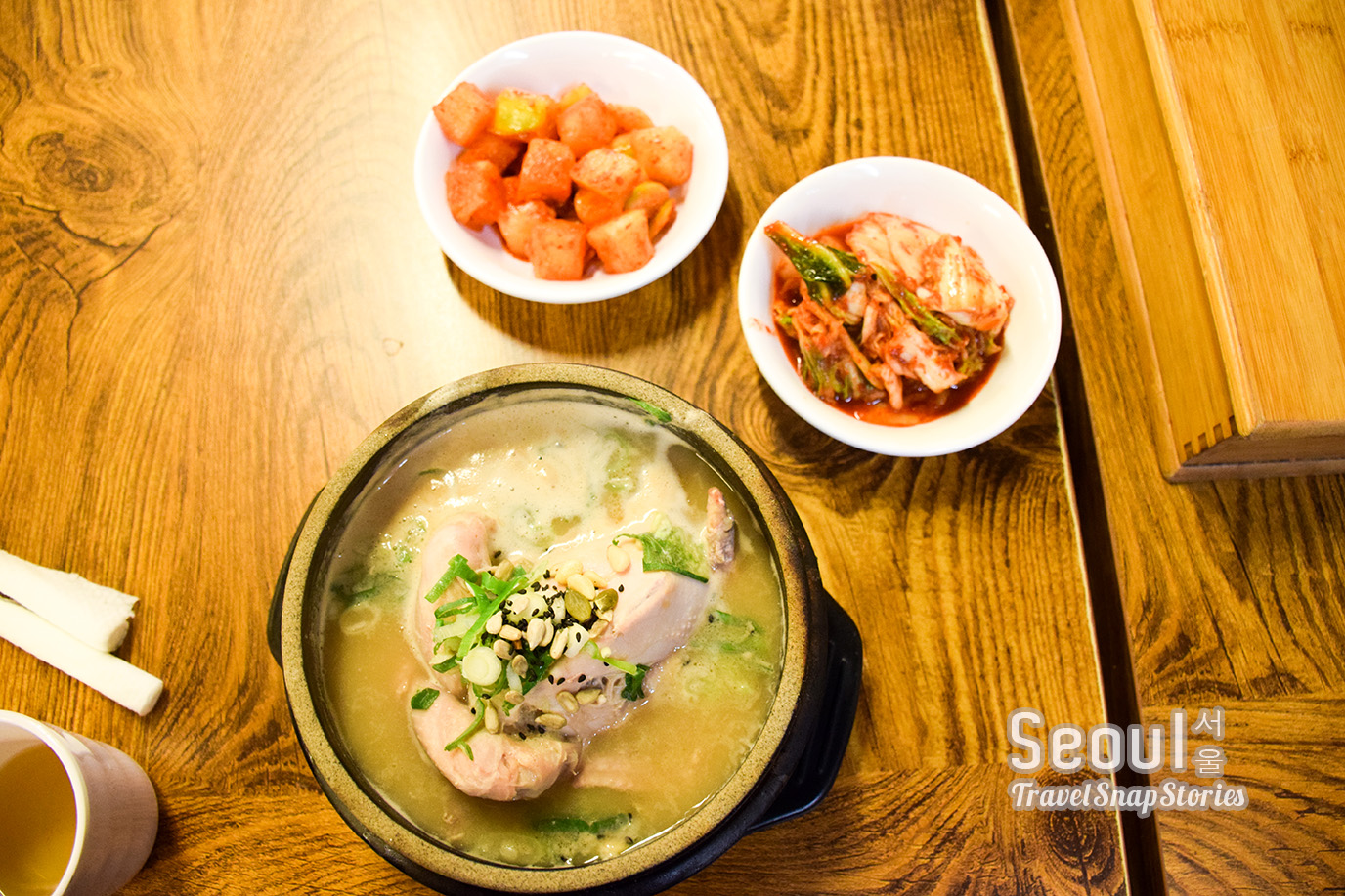 From Bukchon Hanok Village, we took the subway for one stop from Anguk Station to Gyeongbokgung Station, then walk down Jahamum-Ro before turning left to a smaller street (Jahamun-ro 5-gil) to reach the restaurant selling Korean Ginseng Chicken Soup.
