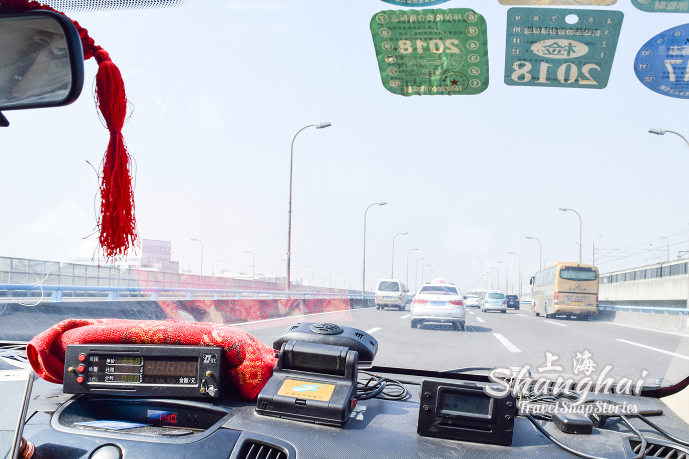 The taxi meter started at 15 Yuan (some bigger or newer taxis would start at 16 Yuan or higher)(Note: taxis in Suzhou and Hangzhou start their meters at a lower fare) and would stay there for quite a while, after which, would increment at 1 Yuan at a time. The driver’s license registration number would also be displayed prominently near the front glass panel at the passenger seat.