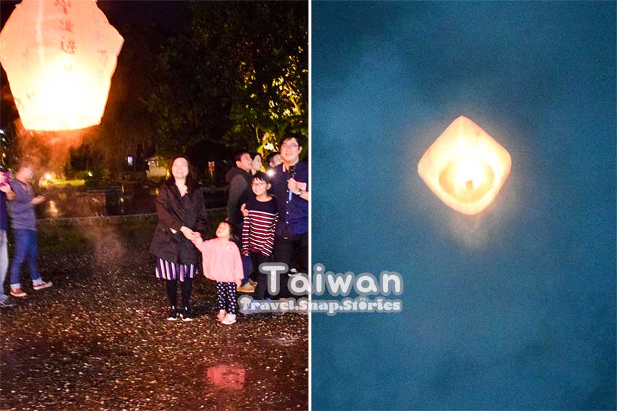 The staff then helped us to put in the burning paper and we went outside, to the open ground of the Toucheng Leisure Farm. He lit the lantern and took a picture of us (unfortunately, was blurred) as it floated into the sky.