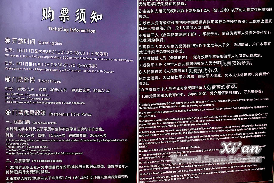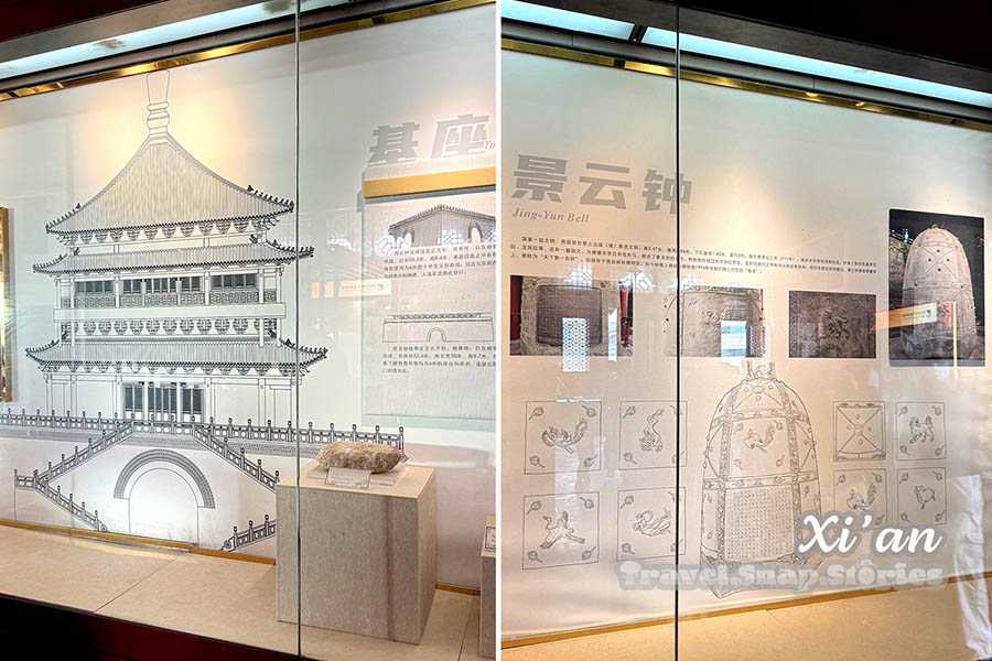 The Bell Tower of Xi’an 西安钟楼 was built in 1384 during the early Ming Dynasty and is a symbol of Xi’an and one of the grandest of its kind in China. Xi’an Bell Tower was mainly used for time reporting and publishing news in ancient times. During the Anti-Japanese War, the Xi’an Bell Tower became an alarm station for warning the Japanese air raids because of its high terrain. In 1953, the Jing Yun bell was moved to Xi’an Beilin Museum and is now on display in Dongting. The replica was hung on the January 30, 1997 and open to tourists.