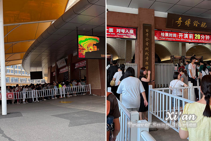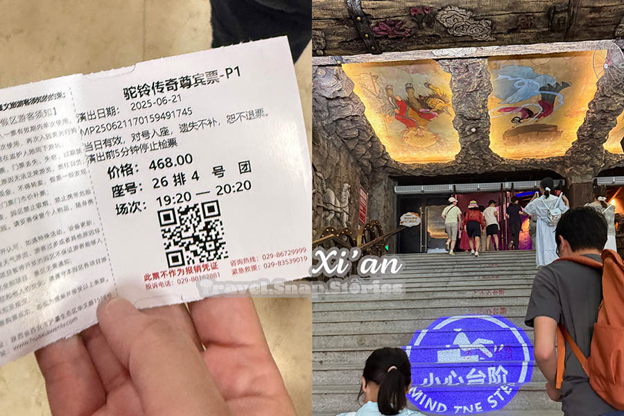 As we were foreigners, it was hard for us to buy the tickets for the exact seating area I want (尊宾票 VVIP) from overseas. Thus, we asked for help from China Highlights RMB 1880 ($8 extra fee) when we booked a full day tour guide for Terracotta Army and Han Yang Ling. The tour guide passed e-tickets to us and we had to go to the ticket office in Huaxia Cultural Tourism Xi’an Resort 15 mins before the performance to exchange for a physical ticket before entering. It was a mad rush where we had to quickly stop our dinner and get to the Huaxia area which was out of the city.