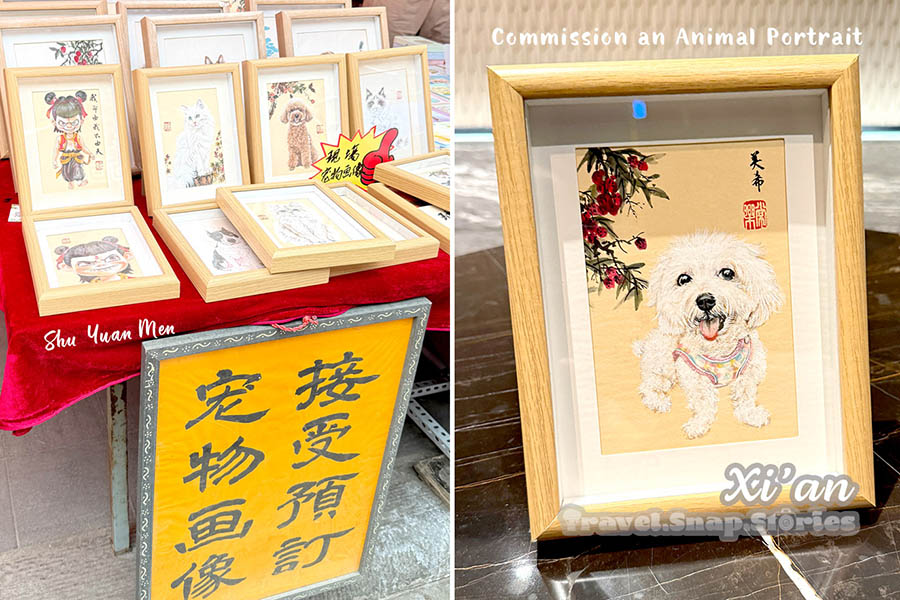Even though it was for pedestrians, we had to still be careful of some people driving small vehicles past us. As we walked from the start to the end, the artwork that caught my attention was of framed animal portraits. I was missing our doggy maltipoo who was with a pet caregiver while we travelled and thought it would be nice to have a keepsake of her. After looking through all the similar “animal portraits” store, the first stall we came upon at the start was still our favourite. Therefore, we walked all the way back to commission a portrait from the artist. To do that, we sent him a photo of our dog through WeChat after linking up with him.